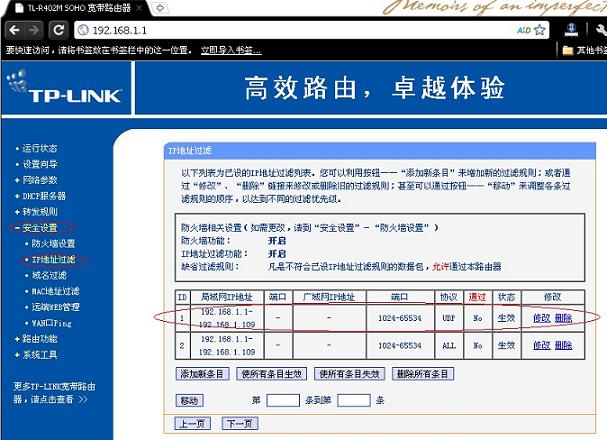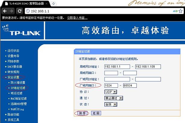 2.接下來打開“安全設(shè)置-- >IP地址過濾”配置需要禁止的UDP端口,具體配置如下圖所示: