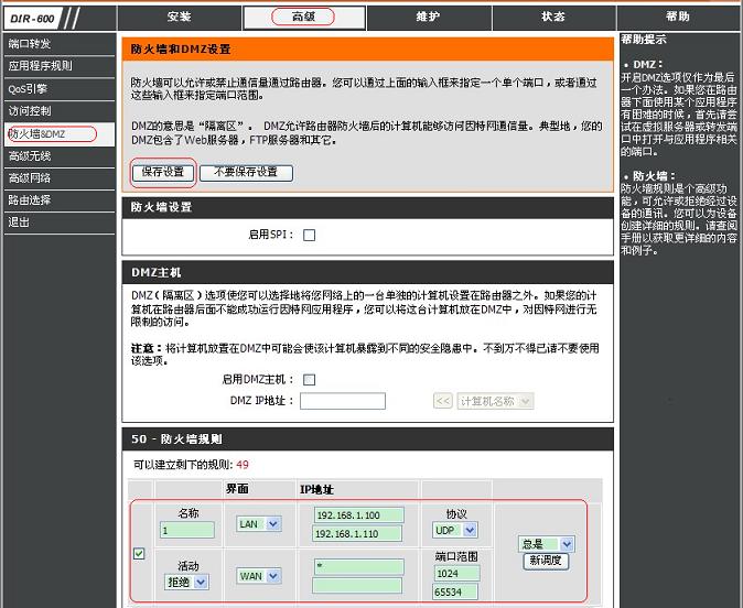 1. 首先登陸路由器,在“高級- - >防火墻&DMZ”里面對防火墻進行設(shè)置,具體設(shè)置如下圖所示: