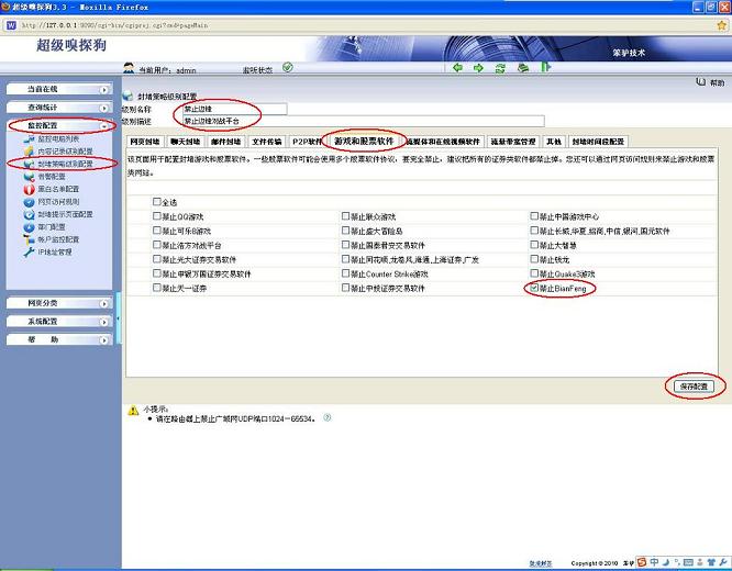 (2)打開超級嗅探狗,在“監(jiān)控配置-- >封堵策略級別配置-- >編輯-- >禁止BianFeng”,配置如下如所示: