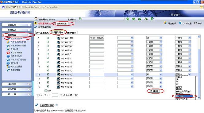 (3)在“監(jiān)控配置-- >監(jiān)控電腦列表-- >計算機列表”中應用封堵規(guī)則,如下圖所示: