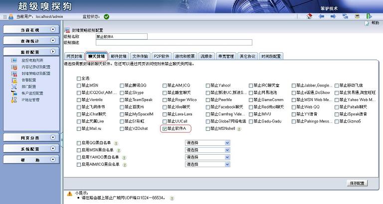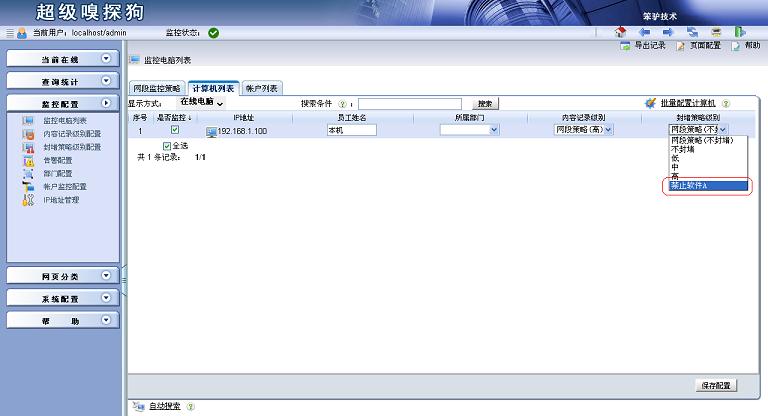 進(jìn)入監(jiān)控配置 -> 監(jiān)控電腦列表。對(duì)需要禁止的電腦進(jìn)行配置,選擇“封堵策略級(jí)別”為“禁止軟件A”,最后保存配置并應(yīng)用新配置。這時(shí)軟件A就無(wú)法通過(guò)TCP端口4902進(jìn)行通訊了,也就代表該軟件已經(jīng)被封堵成功。