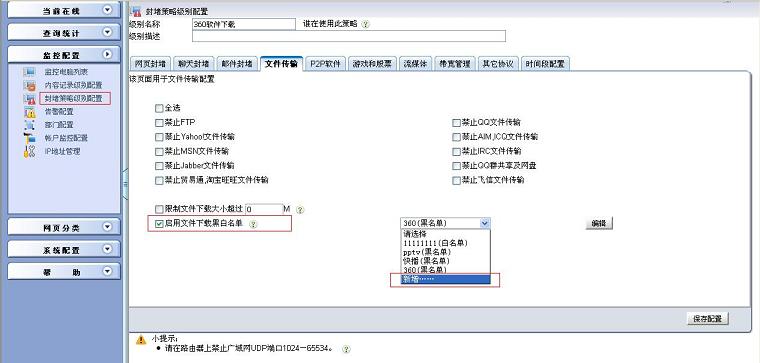 360軟件管家在下載軟件時(shí)所使用的傳輸方式和用網(wǎng)頁下載文件是相同的HTTP傳輸方式,所以只要在封堵策略中添加文件下載黑白名單,并選擇相關(guān)的文件格式即可。