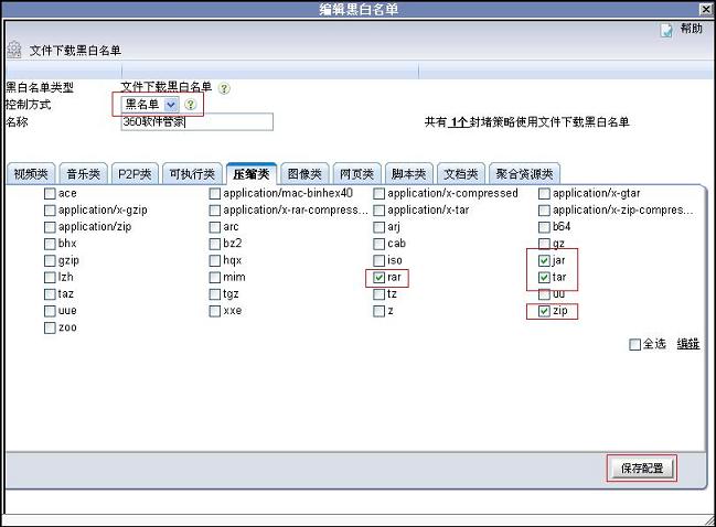 2. 在黑白名單對話框中選擇控制方式為“黑名單”,在可執(zhí)行類選擇exe、msi,在壓縮類選擇jar、rar、tar、zip。最后單擊“保存配置”