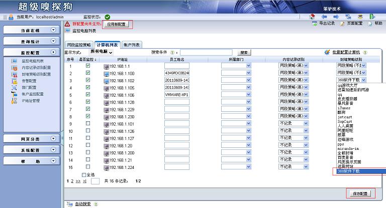 3. 后退后再次“保存配置”,在監(jiān)控電腦列表中為相應(yīng)的電腦選擇剛才設(shè)定好的封堵策略,保存配置,應(yīng)用新配置。
