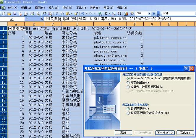 步驟4:將右邊數(shù)據(jù)透視表字段列表中的字段(姓名、網(wǎng)站分類、域名)雙擊添加,并把“訪問次數(shù)”在下拉列表中選擇添加到“數(shù)據(jù)域”,在左邊的區(qū)域中將會顯示統(tǒng)計(jì)后的結(jié)果。具體結(jié)果如下圖所示: