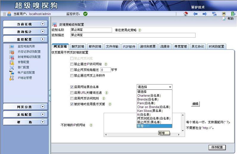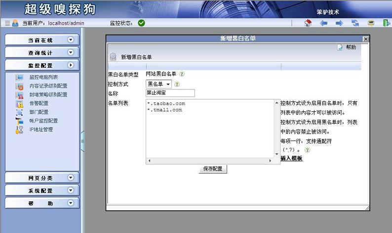 步驟二:彈出“新增黑白名單”,“控制方式”選擇黑名單,名稱中輸入“禁止淘寶”,在名單列表中輸入“*.taobao.com”和“*.tmall.com”。點(diǎn)擊“保存配置”。具體如下圖所示: