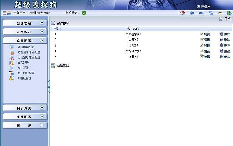 步驟1:點(diǎn)擊監(jiān)控配置->部門配置,進(jìn)入“部門配置”界面,點(diǎn)擊“新增部門”,即可新增幾個(gè)部門。具體如圖所示: