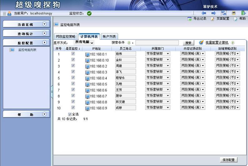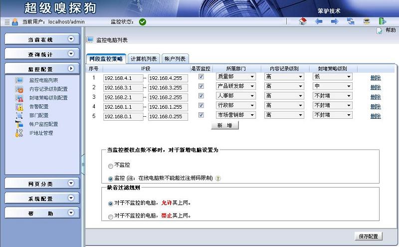 步驟3:點(diǎn)擊監(jiān)控配置->監(jiān)控電腦列表,進(jìn)入“監(jiān)控電腦列表”界面,單擊切換到“網(wǎng)段監(jiān)控策略”選項(xiàng)卡,可以為每個(gè)部門選擇不同的封堵策略級(jí)別。具體如下圖所示: