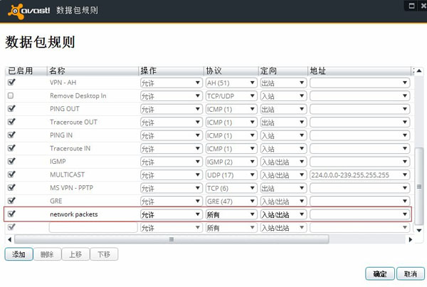 3. 增加一條新的數(shù)據(jù)包規(guī)則:取一個(gè)名稱,允許所有的協(xié)議通過(guò),保存配置。
