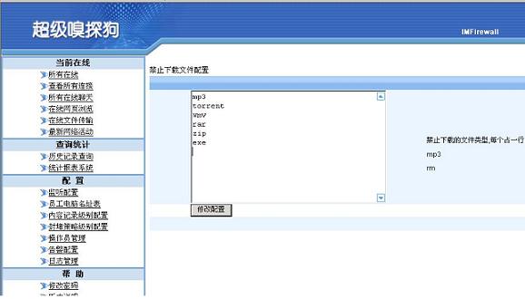 如果是要禁止從網(wǎng)頁上面下載文件,需要在超級(jí)嗅探狗的封堵級(jí)別里面啟用“下載文件控制”,然后把不允許下載的文件類型添加在“下載文件控制”列表中。如下圖所示: