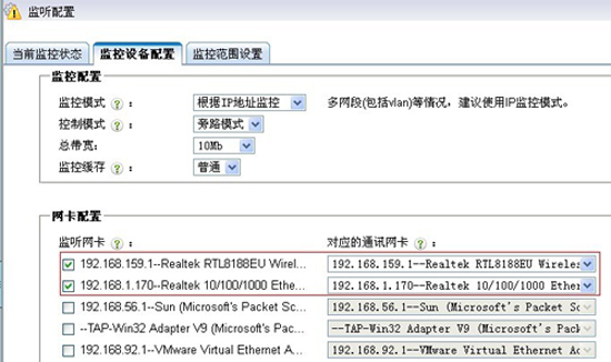 1). 在“監(jiān)聽配置->監(jiān)控設(shè)備配置”中選擇相對應(yīng)的兩塊監(jiān)聽網(wǎng)卡,保存配置。每塊網(wǎng)卡都接到對應(yīng)局域網(wǎng)的鏡像端口。