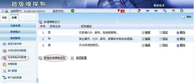 打開WFilter 進(jìn)入到“監(jiān)控配置” -- “封堵策略級別配置”,點(diǎn)擊“新增封堵策略級別”。