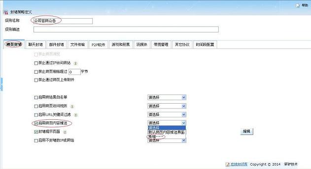 輸入級別名稱以及級別描述,(如:公司官網(wǎng)通知),選中網(wǎng)頁封堵選項(xiàng)卡,選擇“啟用網(wǎng)頁推送” ,點(diǎn)擊新增。