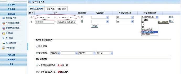 進(jìn)入到監(jiān)控配置 -- 網(wǎng)段封堵策略,點(diǎn)擊新增,輸入想要封堵的網(wǎng)段如:192.168.1.160-192.168.1.170 ,封堵級別選擇新增的“公司官網(wǎng)通知”。