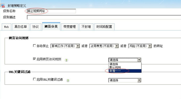 1.首先,您需要在監(jiān)控配置->封堵策略級別配置中,新增一個封堵策略級別,在網(wǎng)頁分類選項卡中,勾選“啟用網(wǎng)頁訪問規(guī)則”,并在后面的下拉列表中,點擊“新增”,并保存配置。具體如下圖所示: