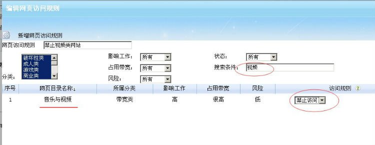 2.彈出的“編輯網(wǎng)頁訪問規(guī)則”界面,搜索“視頻”,將音樂與視頻設為禁止訪問,并保存配置。具體如下圖所示: