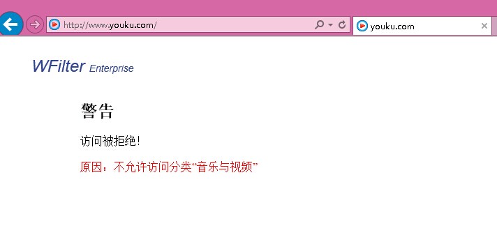 4.當被實施該封堵的電腦訪問您所禁止的視頻網(wǎng)站時,會出現(xiàn)以下封堵頁面: