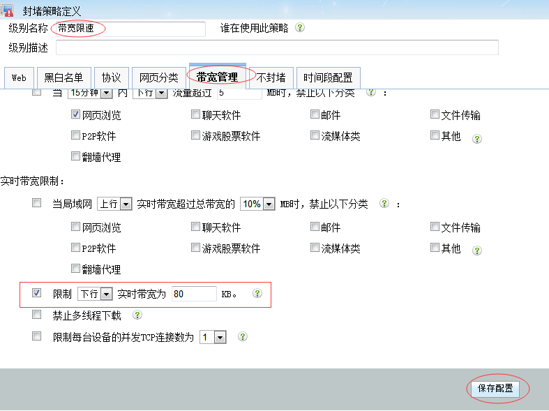 4.在“監(jiān)控配置-封堵策略級別配置”中新增封堵策略級別。輸入名稱,在帶寬管理選項(xiàng)卡中,對下載實(shí)時帶寬進(jìn)行限制,如下圖所示: