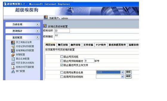 如果只是要禁止網(wǎng)頁(yè)上傳,只需選擇“封堵級(jí)別策略配置”,然后選擇“網(wǎng)頁(yè)封堵”