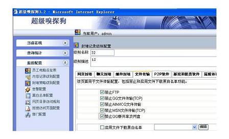 如果要禁止聊天軟件和FTP上傳文件,只需選擇“文件傳輸”標(biāo)簽,在禁止選項(xiàng)前打勾即可