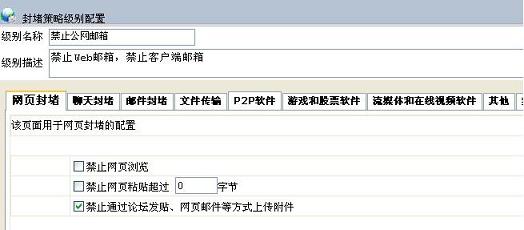 首先,我們需要先新增一個(gè)封堵策略級(jí)別.選擇"監(jiān)控配置"->"封堵策略級(jí)別配置",點(diǎn)擊"新增級(jí)別"可以打開封堵級(jí)別配置頁面.輸入名稱,描述,對(duì)于web郵件只需在"禁止通過論壇發(fā)貼、網(wǎng)頁郵件等方式上傳附件"前打勾即可.如圖: