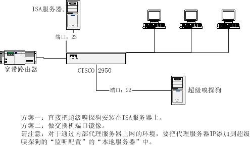 如上圖所示,代理服務(wù)器連接到交換機(jī)的23端口, 監(jiān)控主機(jī)連接到交換機(jī)的22端口。由于超級(jí)嗅探狗只需要監(jiān)控互聯(lián)網(wǎng)數(shù)據(jù),所以只要把23端口的數(shù)據(jù)鏡像到22端口即可。 CISCO2950端口鏡像配置語法: monitor session session_number {destination {interface interface-id [, | -] [encapsulation {dot1q}] [ingress vlan vlan id] | remote vlan vlan-id reflector-port interface-id} | {source {interface interface-id [, | -] [both | rx | tx] | remote vlan vlan-id}} 在本例中: 1. 把23設(shè)置為源端口 monitor session 1 source interface Fa0/23 2. 把22端口設(shè)置為鏡像的目的端口。 monitor session 1 destination interface Fa0/22 ingress vlan 1 請(qǐng)注意: 默認(rèn)情況下,cisco的鏡像口是只能接收數(shù)據(jù)不能發(fā)送數(shù)據(jù)的,而超級(jí)嗅探狗需要發(fā)送數(shù)據(jù)來實(shí)現(xiàn)封堵功能。所以需要“ingress vlan 1”的參數(shù)。 有些cisco交換機(jī)不能支持ingress語法(鏡像口不能通訊),如果您的cisco交換機(jī)鏡像口不支持ingress,那么需要在超級(jí)嗅探狗的“監(jiān)聽配置”中設(shè)置通訊網(wǎng)卡。具體步驟如下: 1. 把23設(shè)置為源端口 monitor session 1 source interface Fa0/23 2. 把22端口設(shè)置為鏡像的目的端口,如下語法使鏡像口只能接收不能發(fā)送。 monitor session 1 destination interface Fa0/22 3. 在監(jiān)控主機(jī)上增加一塊網(wǎng)卡,接上網(wǎng)線并且連接到交換機(jī)。 4. 到超級(jí)嗅探狗的“監(jiān)聽配置”中,把“通訊網(wǎng)卡”修改為您新增的這塊網(wǎng)卡。 超級(jí)嗅探狗相關(guān)功能: 聊天監(jiān)控,郵件監(jiān)控,禁止QQ聊天,禁止MSN,禁止PPLive,禁止P2P下載,禁止網(wǎng)頁,禁止MSN文件傳輸,禁止QQ文件傳輸。