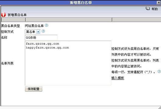 1. 在“監(jiān)控配置 -> 黑白名單配置”新增一個(gè)屏蔽QQ農(nóng)場(chǎng)的網(wǎng)站黑名單,如下圖所示: