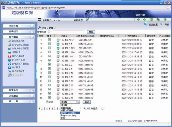 在超級(jí)嗅探狗的“監(jiān)控配置”->“IP地址管理”頁面,勾選您需要綁定的電腦,點(diǎn)擊下拉菜單的“啟用IP-MAC綁定”,再點(diǎn)擊確認(rèn),應(yīng)用新配置,就可以輕松實(shí)現(xiàn)綁定。2. IP-MAC綁定后的效果