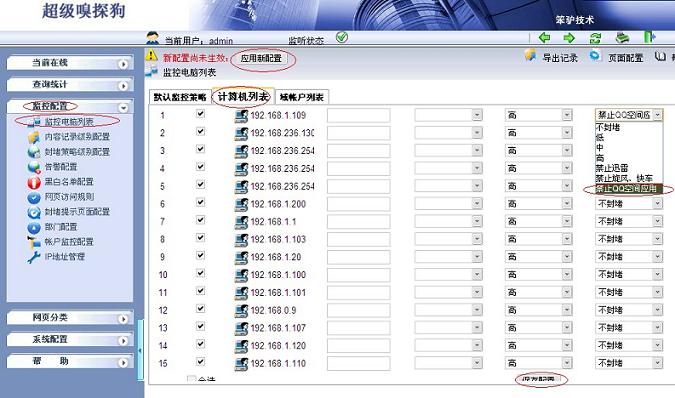 6.在“監(jiān)控配置-- >監(jiān)控電腦列表”中應用封堵策略,如下圖所示: