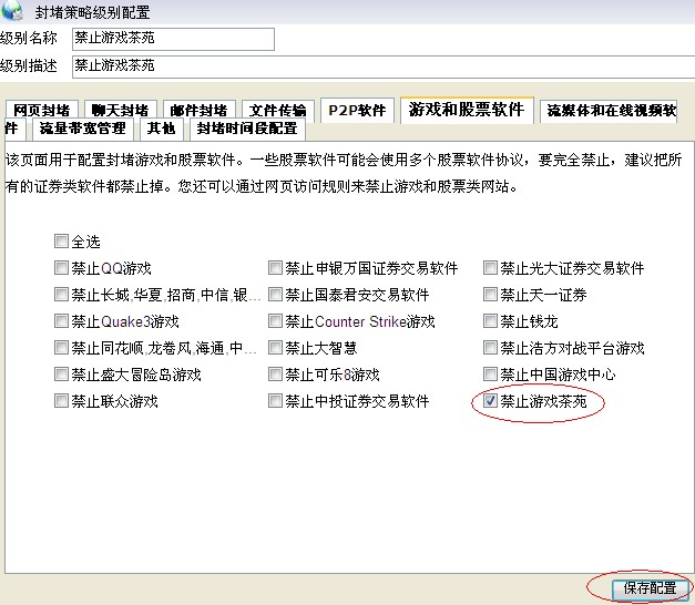 1.3 在“監(jiān)控配置->封堵策略級(jí)別配置”點(diǎn)擊“ 新增級(jí)別”,級(jí)別名稱為禁止游戲茶苑,在“游戲和股票軟件”選項(xiàng)卡中增加了用戶自定義的“禁止游戲茶苑”選項(xiàng),選中“禁止游戲茶苑”的復(fù)選框點(diǎn)擊保存。如下圖所示: