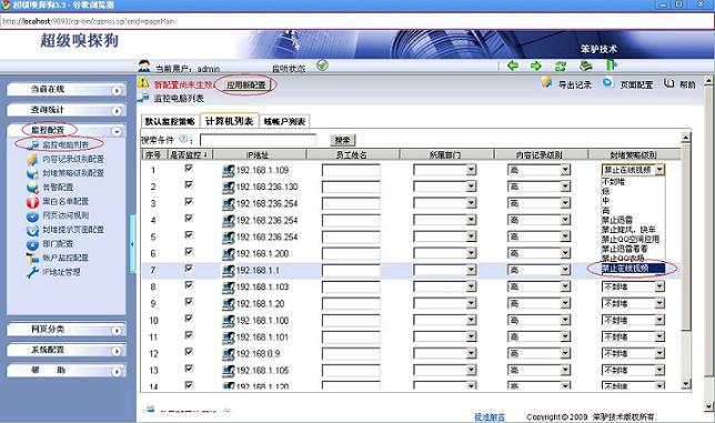 2. 在“監(jiān)控配置-->監(jiān)控電腦列表”中應(yīng)用封堵策略。