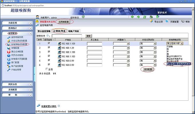 (3)在“監(jiān)控配置-- >監(jiān)控電腦列表-- >計算機(jī)列表”中應(yīng)用封堵規(guī)則,如下圖所示: