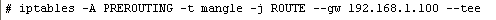 iptables -A PREROUTING -t mangle -j ROUTE --gw 192.168.1.100 --tee
